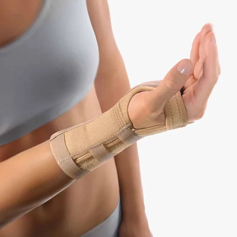 "„Diese Orthese eignet sich ideal bei akuten Schmerzen oder Entzündungen im Handgelenk. Die aluminiumbasierte Führung gibt Halt und hilft, das Gelenk ruhigzustellen, ohne die Greiffunktion zu blockieren.“"